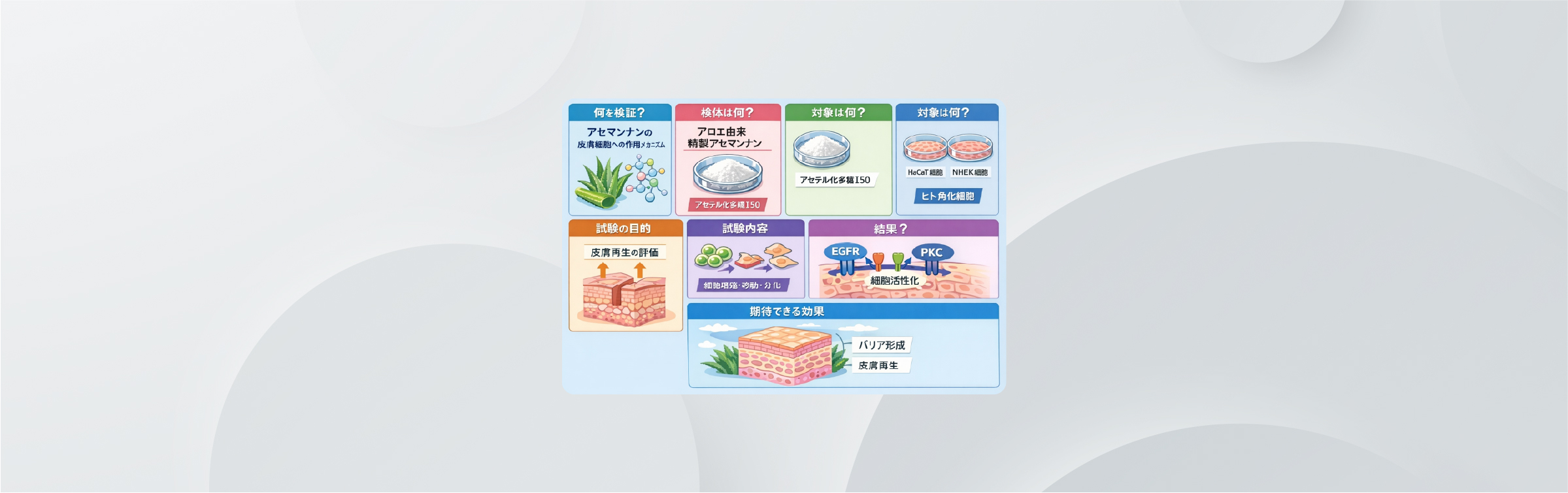 本研究では、皮膚の構造維持およびバリア機能形成に重要な役割を担う角化細胞を用いた試験において、アセマンナンが角化細胞の増殖、移動、および分化を促進する作用を有することが確認されました。さらに、その作用が皮膚細胞の機能制御に関与するEGFR(上皮成長因子受容体)およびPKC(プロテインキナーゼC)シグナル経路の活性化を介して発現することが明らかとなりました。